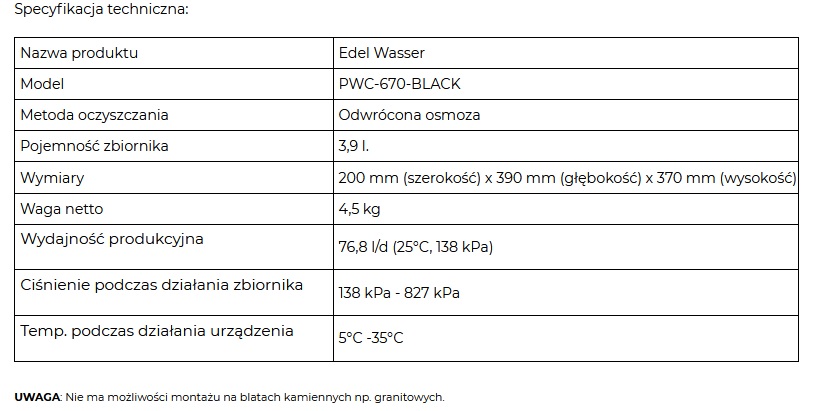Filtr Edel Wasser działa na zasadzie odwróconej osmozy, a samo urządzenie otrzymało certyfikat Stowarzyszenia Jakości Wody. To kompaktowe, łatwe w instalacji urządzenie cechujące się pięknym wzornictwem, doskonale wkomponuje się w wystrój każdej kuchni, a wydajność sięgająca nawet 80 litrów wody w ciągu dnia zaspokoi pragnienia nawet dużej rodziny. Oczyszczacz korzysta z naturalnego ciśnienia wody i nie wymaga zasilania energią elektryczną. W przypadku gdy ciśnienie jest zbyt wysokie sam reguluje jego poziom. Edel Wasser firmy Zepter to inteligentny system zaprojektowany w taki sposób aby poprawić jakość Twojego życia i chronić Twoje zdrowie. Dostępny jest w kolorach czarnym oraz złotym.