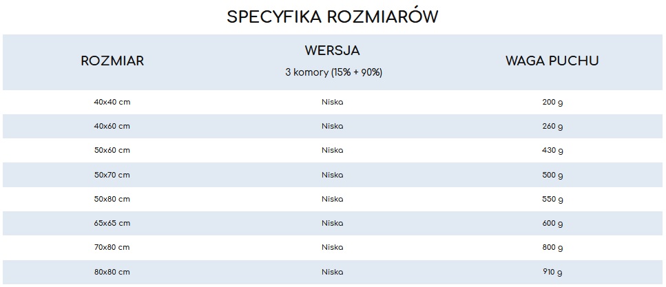Poduszka puchowa antyalergiczna NISKA - miękka poduszka z mniejszą ilością wypełnienia w wewnętrznej komorze. Zapewnia niskie podparcie dla głowy. Idealna dla dzieci, osób o drobnej budowie ciała oraz do spania na brzuchu lub plecach.
