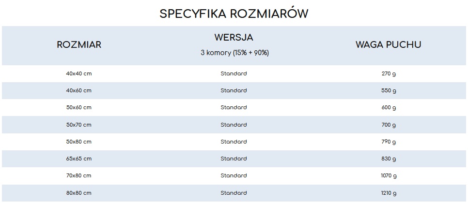 Wypełnienie: Biały puch gęsi: 90% warstwy zew.; 15% warstwa wew. i 85% drobne piórka warstwa wew.