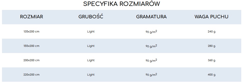 - Wyjątkowo lekkie i ciepłe. Stworzone zostały aby zapewniać komfort snu na najwyższym poziomie przy jednoczesnym ograniczaniu kontaktu użytkownika z alergizującymi mikrocząsteczkami.