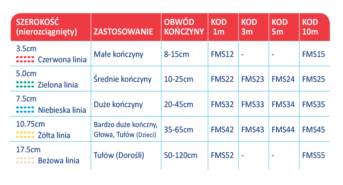 Należy zmierzyć obwód w najszerszym miejscu tej części ciała, która ma być zakryta bandażem i na podstawie tej wartości dobrać odpowiedni rozmiar bandaża w tabeli rozmiarów zamieszczonej poniżej.
