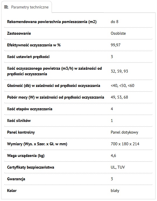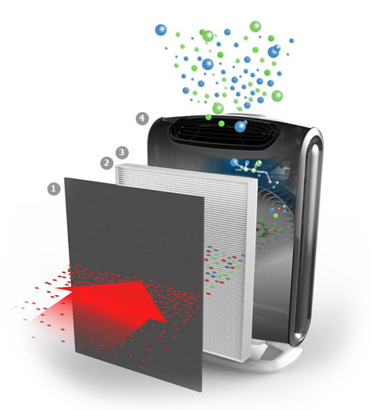 - Usuwa 99,97% zanieczyszczeń powietrza tak małych jak 0,3 mikrona dzięki czterostopniowemu procesowi filtracji.