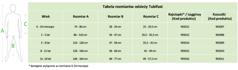 Uwaga: Zaleca się, aby Tubifast® Garments z technologią TwoWay Stretch® miała rozmiary zgodne z wymiarami, a także wiekiem dziecka. W razie jakichkolwiek wątpliwości co do wyboru rozmiaru należy wybrać kolejny największy rozmiar.
