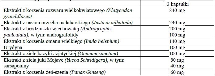 Składniki: ekstrakt z korzenia rozwaru wielkokwiatowego (Platycodon grandiflorus), ekstrakt z nasion orzecha malabarskiego (Justicia adhatoda), ekstrakt z brodziuszki wiechowatej (Andrographis paniculata)/w tym 50% andrografolidów/, ekstrakt z korzenia omanu wielkiego (Inula helenium), urydyna, ekstrakt z ziele bazylii świętej (Ocimum sanctum), ekstrakt z ziela juki Mojave (Yucca Schridigera)/w tym 50% saponin/, ekstrakt z korzenia żeń-szenia (Panax Ginseng), substancja glazurująca: hydroksypropylometyloceluloza